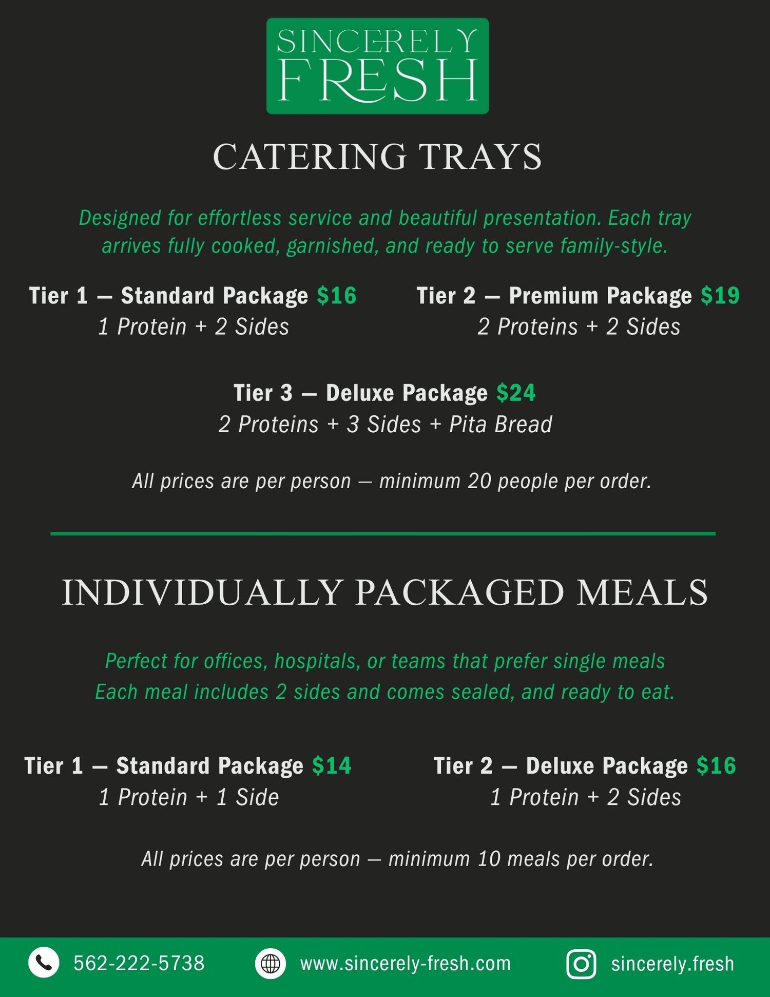 From corporate lunches to family gatherings, Sincerely Fresh offers healthy, chef-prepared meals delivered on time, every time. Fill out the form below and tell us about your event — number of guests, preferred dishes, date, and delivery location.